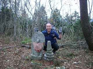 山道に入って1時間半ほどで峠に到着。立て札とお地蔵さんがあった。