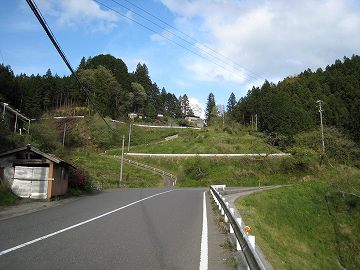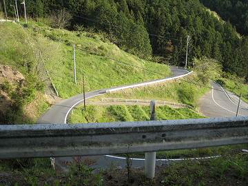 | 峠直下にはグルグル曲がるつづら折れがある。 | 2段上がったところから下を見る。 |