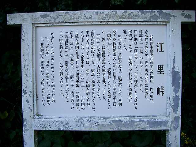長崎県佐々町江里免と江迎町乱橋免の間にある県道227号線の峠である。かつての平戸往還らしく、峠には案内板があった。 かつての街道らしき峠道