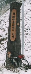 郡上八幡から金山間のR256にある。 八幡の町を抜け、せせらぎ街道との分岐点を過ぎると登りが始まる。九十九折れの厳しい坂を登るにつれて八幡の城や町並みが眼下に見えるようになり、ほどなく峠に到着する。逆コースは金山から長く緩い登りとなる。 写真はランドナー補完委員会の仲間と走った日の写真で、お彼岸の中日というのに時ならぬボタン雪に見舞われた時のワンショットである。