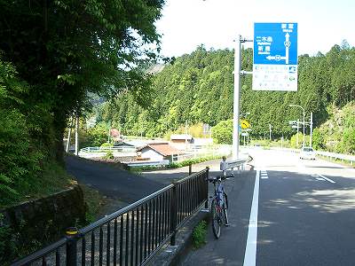 国道42号線の飛鳥町小阪の分岐には大きな道案内が出ている。「新鹿、二木島、熊野古道、逢神坂峠」などと・・・その看板のある信号交差点の北に旧道分岐があった。簡易舗装の1車線道だ。旧道分岐(9:09)