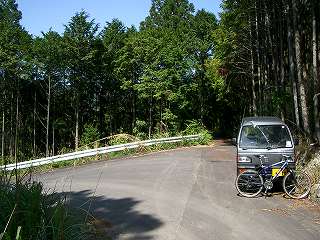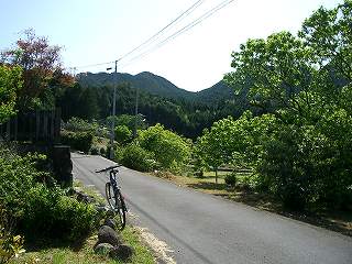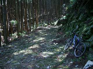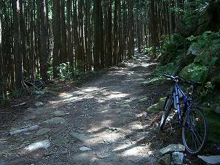 ここのダート路面はでこぼこして走りにくい。それもそのはず、石畳とまではいかないけれど、かなりの密度で道に石が埋まっている。さすが熊野古道のお膝元である。何度かカーブを曲がりながら登るうちに分岐点が現れた。直感的に直進方向の右へ進んだ。