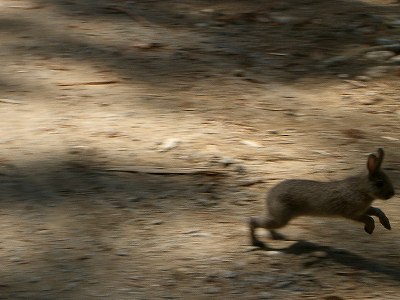 そしてカーブを曲がって目を疑った。道の真ん中が材木置き場になって行き止まりになっている。野ウサギも手前でストップし、こちらの出方をうかがっている。私としても材木置き場の向こうがどうなっているか確かめねばならないので動きかけた。すると野ウサギは急にこちらに向かって跳んできた。あわててカメラを構える。あっという間に目の前を横切っていった。デジカメはタイムラグを起こしながらウサギをかろうじて捉えていた(^^ゞ しかし大胆な奴っちゃ!敵?の目の前を横切るとは・・・