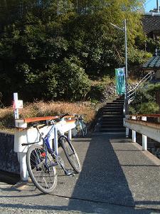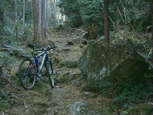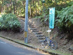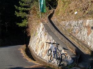 峠から下って車道に出る手前には排水溝のような所を伝って下りてくる。道路沿いに少し行くと左側の進行方向と逆向きに階段が付いている。その階段を乗り越して下った地点に賀田羽根の五輪塔がある。 ・ 再び車道へ