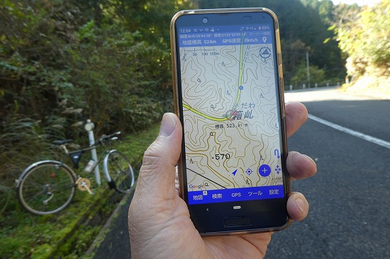 峠は何の変哲もない所。市町村の境界でもないので標識は『落石のおそれ 通行注意』の標識のみ。スーパー地形が役に立つ(^^)v