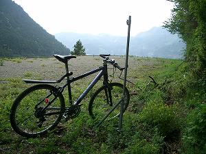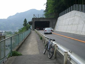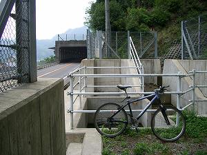 観察してみると、洞門の上に上がるスロープがある。無理矢理登れないことはなさそうである。早速横の入り口から押し入る。金網に沿った空間は狭くて、急で、メチャ難儀である。自転車を担ぎながら金網に手をかけてよじ登った。
