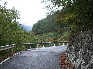 野口ダムの横を過ぎると道は狭く、クネクネしだす。雨模様で山が煙ってしまっている。