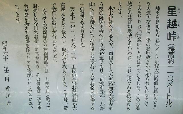 峠には由来を示した看板があって、戦国時代には戦いがあったことなどが書かれている。