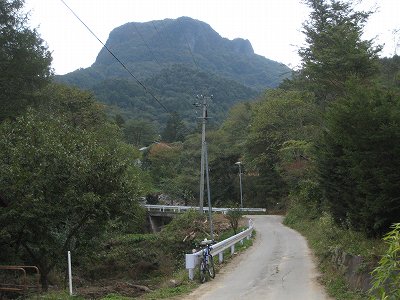 川沿いに登っていくと前方に頭でっかちな山が見えてきた。兜岩山である。名は体を表すという言葉がピッタリの山である。 |