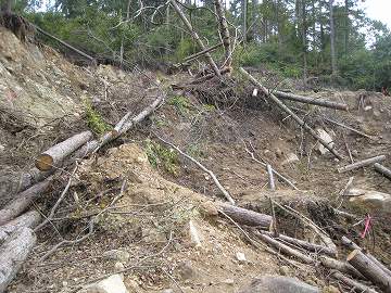 そのまま登ると、謎が解けた。道の先が凄い土砂崩れになっていて、車はここでシャットアウトなのだ。この車は登山客のものなのであろう。しかし、行けるのか?よく見るとピンクのビニールテープがあちこちに結んである。それを目印に行けば突破できそうである。