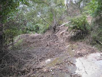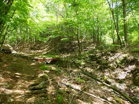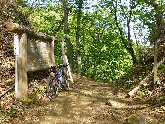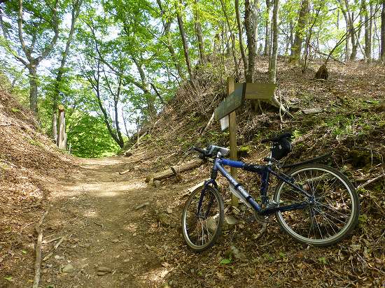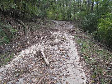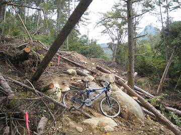 自転車を担いで、フラフラしながら何とか突破。しかし、そこから先も土砂崩れ箇所は続いた。ここで我慢の糸がプッツン。 この峠はもともと押し担ぎの予定があるのに、麓でこんな状態では先が思いやられる。刈谷原峠や馬飼峠のように山靴で臨んだわけでもないので、ここはアッサリあきらめ、周回予定の田口峠へ向かうべく、来た道を引き返した(ToT) |
