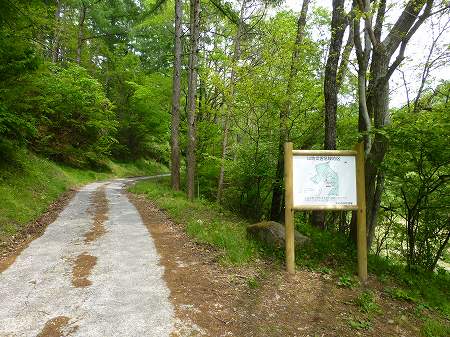 | 荒船山と不動尊の看板 | 舘ヶ沢。林道大沼線(右)との分岐は真っすぐ |