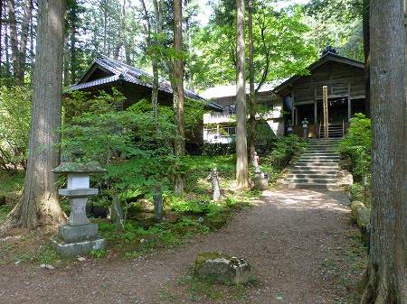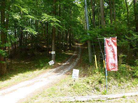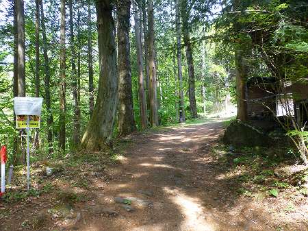 道は荒船不動の境内を進む。意外と立派な本堂を横目に宿坊のような建物を回り込むと、ダブルトラックのダートになる。