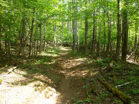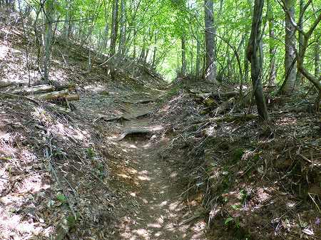 砂防ダムを過ぎると山道に変わる。良く踏み締められた安定した道である。割とゆるやかで歩きやすい。帰りはチョイチョイ乗れるくらいだったからね。それでも峠近くでは勾配も急になった。