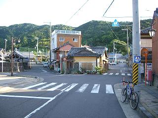 道は熊野市の中心部に近い木本町の変則五差路から始まる。正面左右の右側の道は熊野古道、左は木本高校へ行く道。評議峠へは水準点(7.1m)のあるお寺の前の道を入っていく。変則五差路のお寺の手前を左折(6:48)