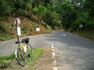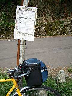 峠は三差路、バス停があって、バス停の足下にはお地蔵さんがいた。峠の三叉路を下ると猪目、高度を落とさずに進むと