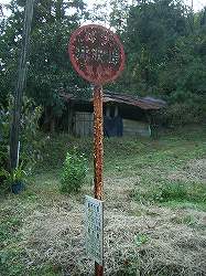 道は1.5車線、さほどあえぐこともなく峠に到着。ここで異なもの発見。錆び付いたバス停である。現役なのかどうか定かではない。現役だとしても目の前にある家は廃屋だし、利用する人があるのか?