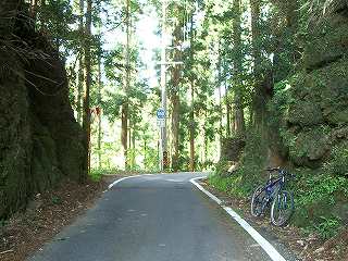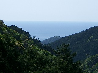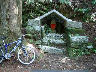 実は峠みたいに見える鞍部の反対側にダート道の分岐があった。しかしこちらを下りても現国道42号線に行けそうに思えなかったので、そのまま舗装道を辿った。道は緩やかなアップダウンを繰り返して進む。カーブにお地蔵さんがあったり、前からは使っている道みたいだ。ここからは海が小山よりも高く見えている(゚o゚) そして国道の喧噪がかすかに聞こえてくる。