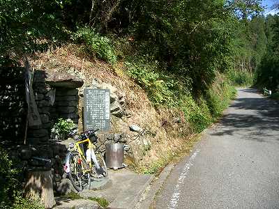 もう峠も近いと思わせる辺りに弘法大師尊像と「経の坂大師由来」の石碑があった。ツーリングマップルなどの地図ではこの峠は経の坂峠になっているが、地元サイトや道路標識では倉羅峠になっているので経の坂峠も間違いでないことがわかった。