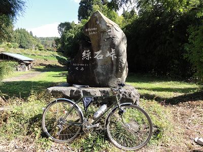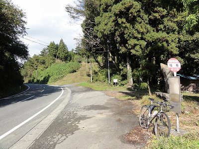 そんなゆるい勾配のまま前方に森が見えてきたら、そのなかに峠があった(゚o゚) 唐突に「繰石峠」という大きな石碑が出現したのだ。石碑の手前には「繰石」のバス停。とにかく色んなものが一気に現れるので面食らってしまった。