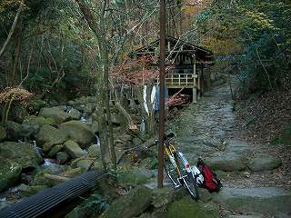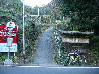 秋月を離れ、車道を登っていく。茶店の店先にある旧八丁道の看板から旧道へ入る。野鳥川の川沿いには石畳道が残っていた。