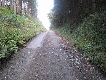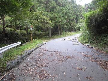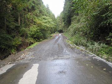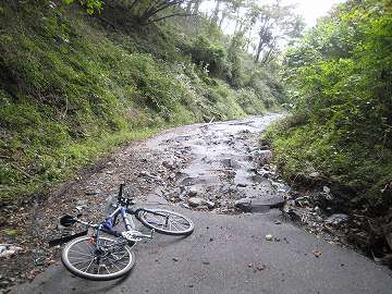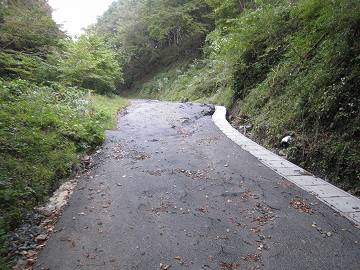 とのこと。行ければ上出来。やれ、嬉しや。とそのまま旧道に突入。片側だけ真新しい側溝が整備されていて、路面は写真のようにガタガタである。台風など集中豪雨による路盤陥没といったところか?しかも傾斜は急と来ている(~_~) そりゃそうだ。急傾斜だから水も激しく流れたんだろう。