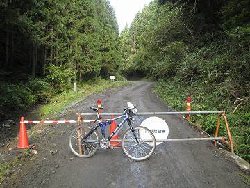 それでも根性とテクニックで降りずに乗り切る(^^ゞ 路盤陥没地点の先で側溝の蓋が散乱していた。置いてあるにしては乱雑なので出水によって浮き上がったものだろう。ほんと水のパワーは凄い(゚o゚) 少し登ると舗装が切れてダートになった。先ほどの路盤陥没箇所みたいな状態から整地したのだろうか?そのダートの先に柵が置いてあり、ここまでが通行止め区間だった。