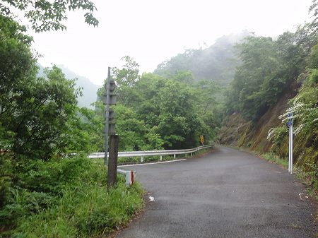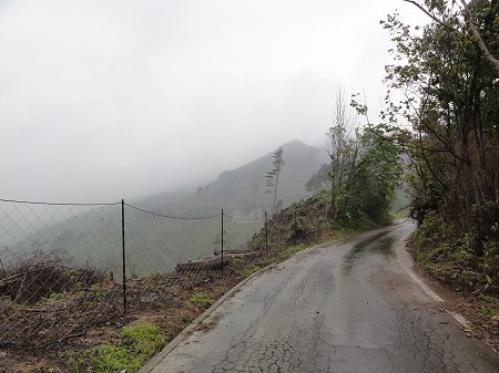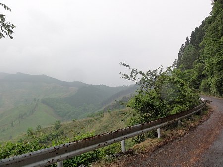 渡川大藪林道の看板が出てくると、スケールのでかい景色が広がりだす。林道は大きく斜面を巻きながら登る。雨模様の林道ではガスって景色もよく見えないが・・・