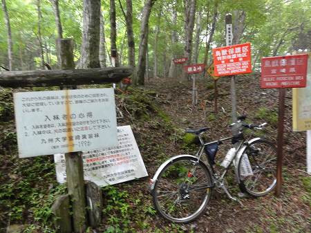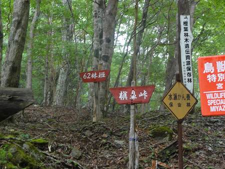 傾斜が緩くなり、小さなボトムに落ち込んだような所に着いた。ここにも林道の看板がある。そして鳥獣保護区とか樫葉林遺伝資源保存林なんて仰々しい看板の中に槇鼻峠の看板もあった。うっかりすると見落としそうだった。