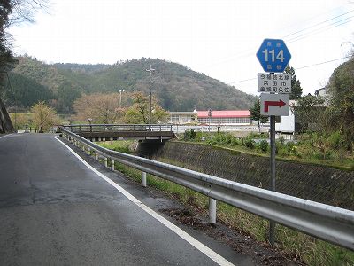 そこで、そのまま広域農道を下り(ジェットコースターのように真っ直ぐなアップダウン)、県道114号線に出て、写真の久佐小学校前に下りていった。 橋のたもとを直進、カーブを曲がって小原谷川沿いを通るのが街道筋である。 |
