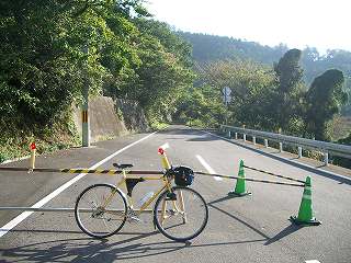 それでもかまわず登っていくと突然それは現れた。路面崩落だ。谷が崩壊したのか山の斜面が崩壊したのかわからぬが、強行突破するにはリスクが大きすぎた(ー_ー)