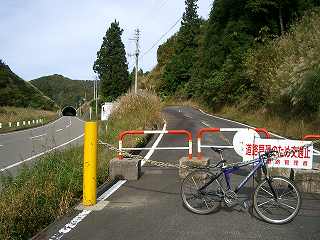 峠は切り通し。ご丁寧にトップに黄色い通行止めのバーが設置してあった。現在の国道が見え、トンネルの真上に位置していることがわかる。