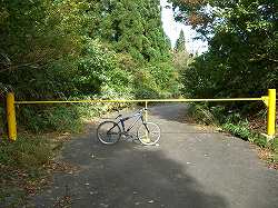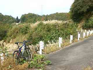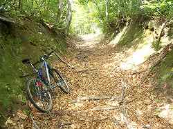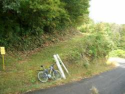 道が塹壕状になっている地点で、地べたにスズメバチを発見。周りで「ぶんぶん」という羽音。「や・やばい!」慌てて通過したが、あまりに雰囲気がいいので塹壕状の道の写真を1枚撮った。途端に高まる羽音。動こうとした瞬間にやられた。左のケツに一発。椎間板ヘルニアのときに射たれたブロック注射みたいな「ず〜ん」とした感覚。2発目をやられないように手にしていたカメラでやられた辺りを叩きながらMTBを引っ張って必死に逃げた。 |