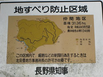 そうこうするうちに峠に到着。ていうか、もともと町村境でもないので、地形で判断しただけだが、峠と思われる場所には長野県の地滑り防止区域という看板があるだけだった。