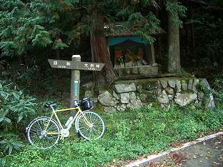 道は1.5車線、舗装はされているが、しっとりとした風情のある道だ。中腹に中国自然歩道の立て札があった。 中国自然歩道の立て札と石仏