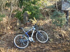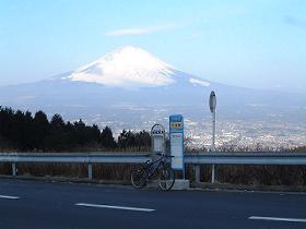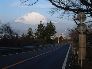 ・ | 峠に到達すると(9:10)、富士山が目の高さに見える。さすがに高みに来ると違う。 展望台に立っているおっちゃんが「この先少しは乗れる所があるかもしれない」と喋りかけてきたが、そんなことより、このおっちゃん、写真を撮りたいのにいつまでも動こうとしない(ー_ー) そのうち先ほどの猟犬コンビの人が「写真を撮って上げる」と言ってくれた。はじめ断ったら、先のおっちゃん、「撮ってもらったら」大きなお世話だ。でも素直にお言葉に甘えたら、展望台から退いてくれた(~_~) 変な人だ。 |
