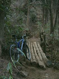 | 山道といっても傾斜は緩めで辛くない。1000m近いというのにどういうわけだ?多分先週の熊野古道がきつすぎたのだろう。西日本にはさほど高くはないのに急な坂が多い。東日本は急坂が少ないかわりにスケールが大きいという特徴がある。 道は少し凍っているが、ベタベタよりも歩きやすい。丸木橋を過ぎて、しばらく登ると犬の声、ポインター(猟犬)が勢い良く下りてきてまとわりついた。飼い主も一緒に下りてきた。 |