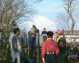 | ここには展望台と同じ高さのお立ち台がある。あるホームページでは何のためにあるかわからないと書いてあったが、これこそ下の写真を撮るためにカメラマンが上がるお立ち台なのであった。 峠には茶屋があって、今日のように富士山が見えると茶屋の主人が写真を撮ってくれる。そう、写真を撮ってくれた人たちは茶屋の人だったのである。 そうこうしてるうちに老年のパーティが登ってきた。とたんに峠がやかましくなったので早々に退散することにした。 |