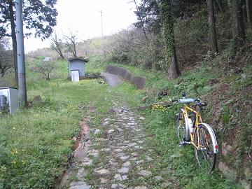 後でどこが峠だかわからないのでGPSでログを取っておいた。 右側のログの下の旗が石畳入り口、上のところが峠と思われる。 |