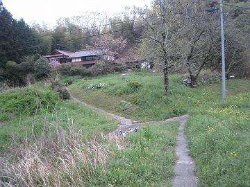石畳が尽きると峠は近い。峠には立派な民家がある。反対側の斜面にある道路は廃道みたいだし、峠手前にあるのも廃車くさい。仮に現役の車だとしたら、石畳を行き来しないと娑婆へ出られそうにないのだが・・・