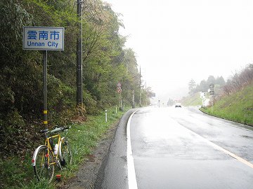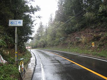 道は2車線だし、雨も降っているので、探索の余地もなしということで、峠に到着。松江市と雲南市の境界になっているので両方の写真を撮ってすぐ次の峠に向かった。