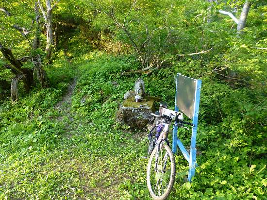 すると、そこには種々の道標、看板、お地蔵さんまで鎮座する旧峠があった。親不知の海岸線が荒れたときの山回り路線。バイパス的な位置づけであったという。草付き道ながら踏み跡がしっかりついている旧道はまだ現役のような錯覚を起こさせるが、藪漕ぎ必至とのことでおとなしく退散する。