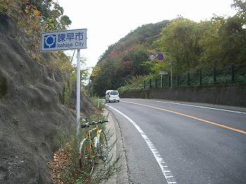 国道パーキングの看板(8:56) 国道の峠(9:00)