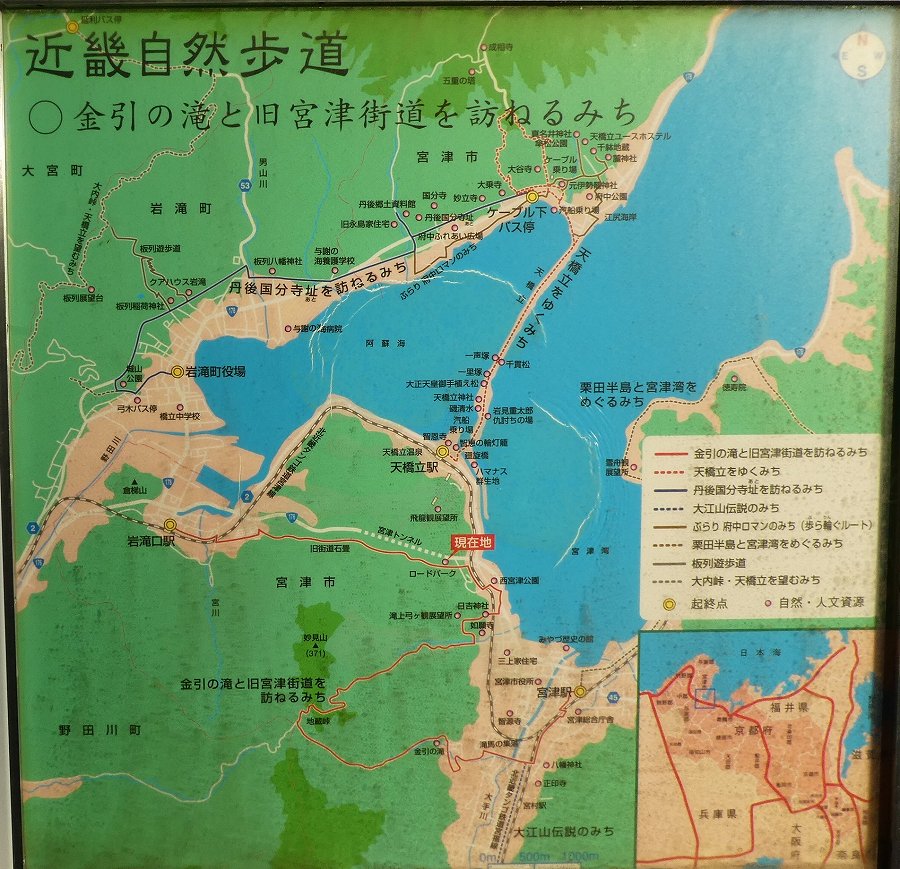 京都府宮津市杉末と須津の間にある旧宮津街道(現・近畿自然歩道)の峠。 国道176号線の宮津トンネル手前にある西宮津ロードパークに車を置いて出発。 ロードパーク脇に掲示されていた案内板の地図を載せておく。表示されているように旧街道の石畳を楽しみにアタックした。 石畳の旧宮津街道という振れ込み。近畿自然歩道でもあるので期待して行った。入り口の宮津ロードパークはなかなかいい感じ。トイレもあるし、近畿自然歩道の案内看板(地図)も設置してある。 |