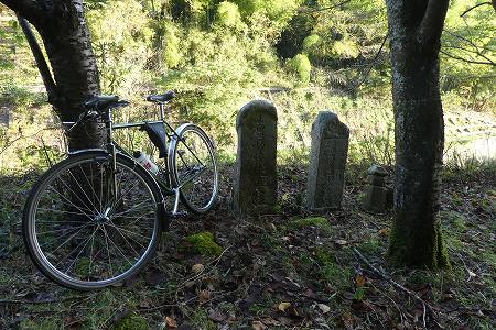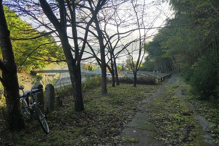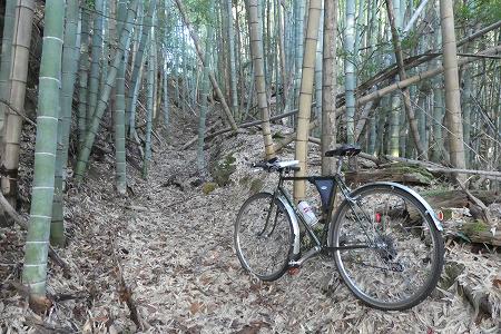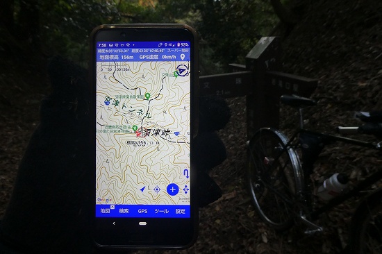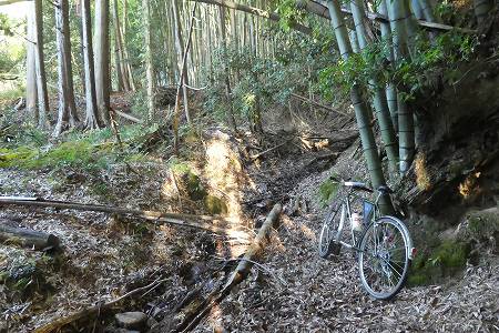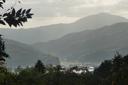 どのくらい整備してあるのかわからないが、道の真ん中から竹が伸びていたりするので、整備状況はイマイチ(-_-;) 時々ルートがわからんようになる。近畿自然歩道しっかりせいよ。で、自転車を置いて探索しながら進む。スーパー地形で峠の位置や距離を確認しながら一喜一憂する。峠近くで展望が開けたところがあったのでワンショット。麓の集落が見えた。