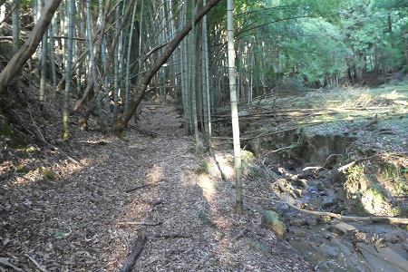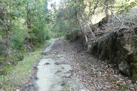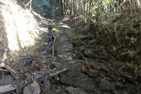 しかし道標が設置してあるところから行く先を見ると写真のような道が現れた。道の両側を水が流れているが、その真ん中にあるコンクリート路面に石が入っている。これが石畳らしい。もともとは本物の石畳だったのかもしれないが、水流で破壊されぬようコンクリートで被った感が興ざめだった。雨水で道が掘れ、倒木はあるわで、とにかく濡れないように気をつけながら登る。その水流から逃れると、傾斜がきつくなり周りが竹林に変わった。土の斜面には階段も付けられていた。竹に変わっても倒れているには変わりなく、倒木を潜ったり乗り越えたりと散々である。