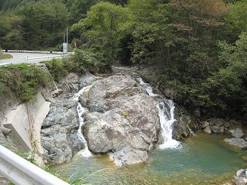 龍岡城を辞し、雨川沿いに谷を遡る。大型車全面通行止の標識が現れる。この谷も台風にやられたのだろうか?少し行くと川縁がえぐられて路肩が崩落している。それでも岩場を流れる滝みたいな川筋が大変美しい谷である。