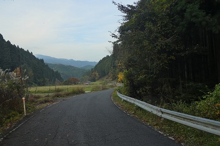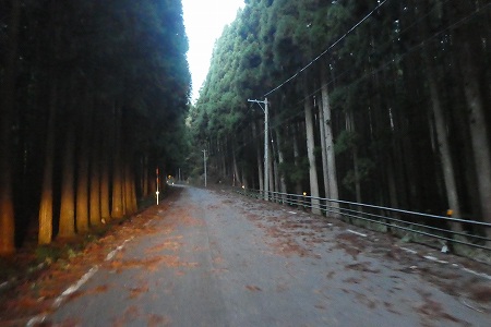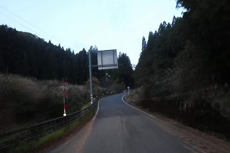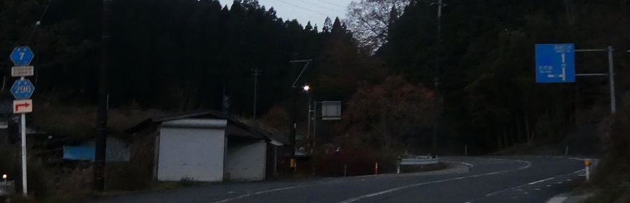 白坪川の谷である。しばらく走った奥新田で右手峠へ向かう県道7号線と大師峠に向かう県道296号線が分岐。まだ暗く、当たりの雰囲気はよくわからない。峠道は1車線道になった。