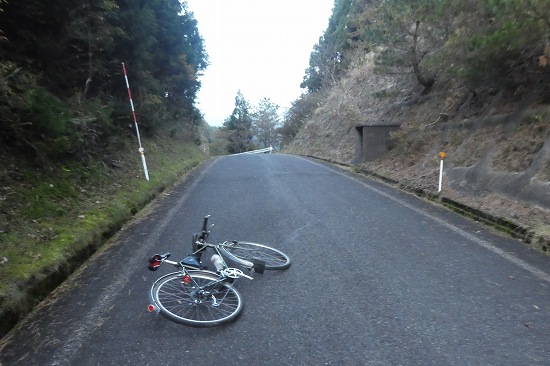 1車線道とはいえ、道幅は広い。薄暗いなかを登る。2回屈曲すると峠に着く。
