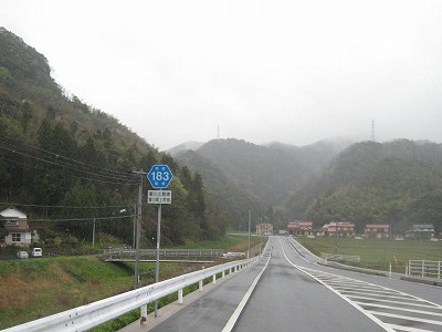島根県斐川町上阿宮と三絡武部東の間にある県道183号・斐川上島線の峠である。 斐伊川の森坂大橋付近から峠道に入る。はじめは2車線道である。行く手はガスった山の中。何となくビビっている(ー_ー) |